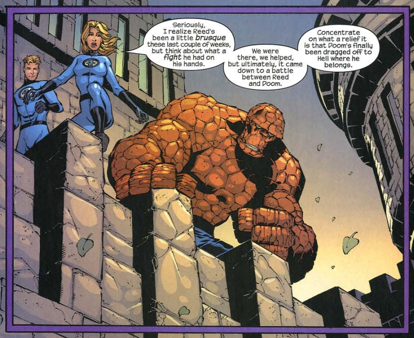 Ben expresses some regret about walking around Castle Doom like they own the place. Reed is all business, however, wanting to keep Doom’s tech from falling into the wrong hands. This includes not only gathering up all the tech but also barricading the castle from outsiders. After working all night, Sue, Ben, and Johnny have a chat at dawn. Ben chides Johnny for putting ideas in Reed’s head, but Johnny says the whole time travel thing last issue was an attempt to get Reed out of his funk and back into action. Sue says the battle between Doom and Reed took a lot out of Reed.