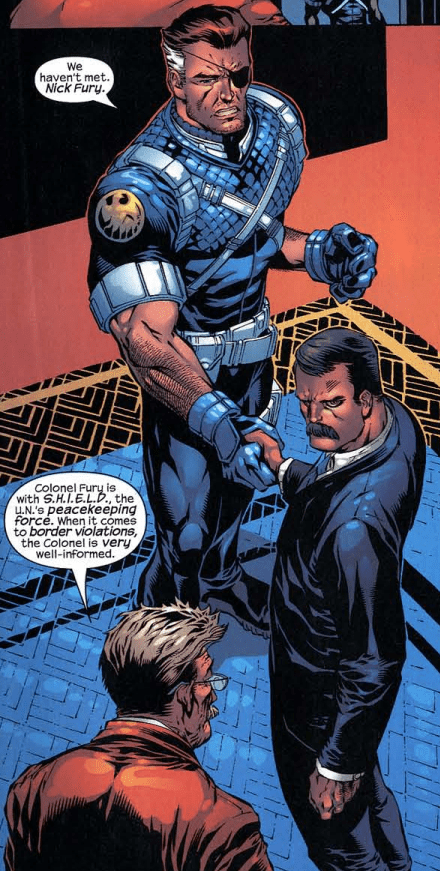 Trivia time: Although introduced with his classic title of “Colonel,” Nick Fury was full-on director of S.H.I.E.L.D. at this point, and was popping up all over the Marvel Universe. After this story arc, his next appearance was in the 2004 Secret Wars, where he’s the one who discovered previously unseen connections between a bunch of Marvel’s biggest bad guys.
