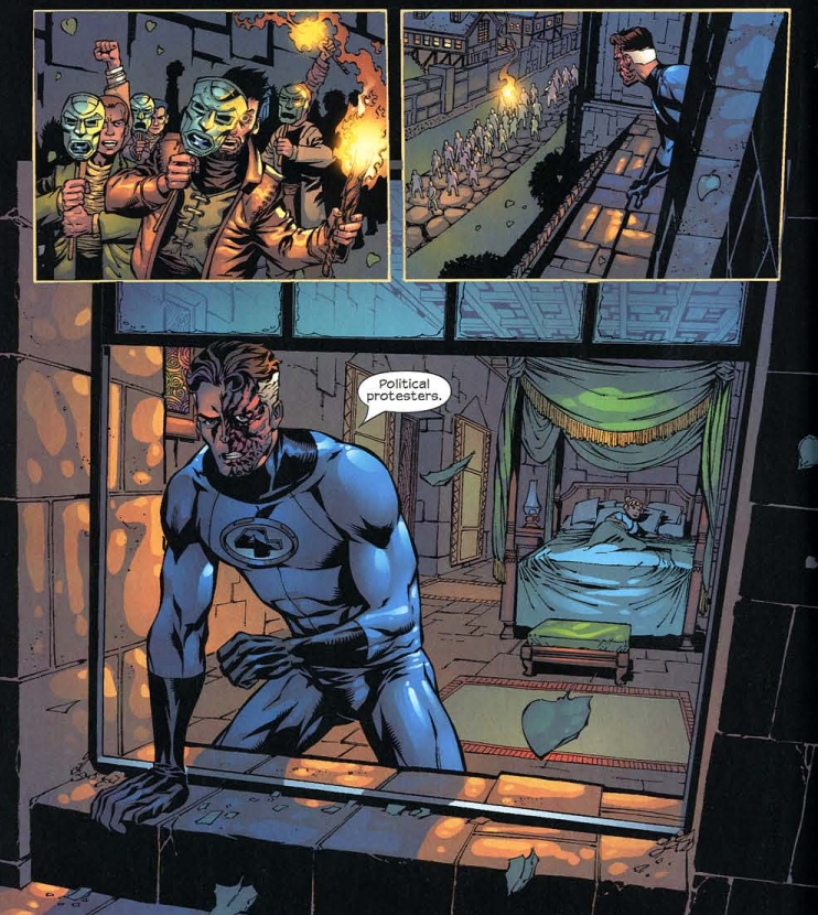 It’s morning at Castle Doom, and political protestors wearing Dr. Doom masks surround the place. Sue, Ben, and Johnny wake up wearing strange devices on their heads. Over breakfast, Reed promises to explain them when the time is right. Reed takes everyone outside to do some exploring. Outside the castle, more Latverians protest the FF’s presence there. The point is again made that the Latverians are misguided, thinking that Doom was benevolent because he supplied all their needs, but only in exchange for their absolute, unquestioning loyalty. Sue says it’s easier for them to live in ignorance rather than constant fear. It’s then that Sue realizes the head devices taught the FF to speak Latverian while they slept.