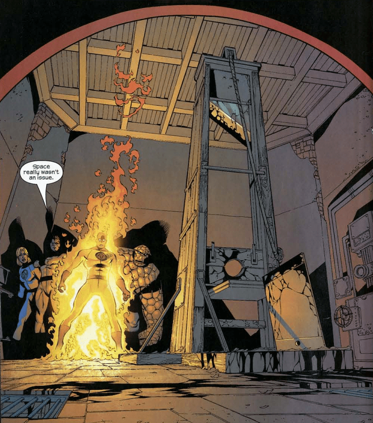 The battle between the FF and Dr. Doom ended with Doom sent to Hell (no, really) and it left Reed’s face irreparably scarred. Now the FF have traveled to Latveria to keep Doom’s advanced tech from falling into the wrong hands. Once there, the FF saw the Latverian populace not knowing anything other than Doom’s rule, and potential invasion from neighboring Hungary. So Reed planted a makeshift FF flag over Castle Doom and proclaimed “We’re not going home.”