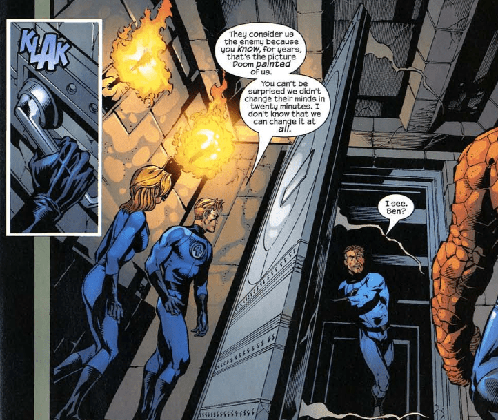 Then it’s back to the castle, where there’s more talk about how Doom controlled the media in Latveria for years and conditioned the populace to think of the FF as evil enemies. Ben argues that being a genius in astrophysics doesn’t necessarily qualify Reed to run a government, and that the Latverians should be allowed to work things out on their own with their newfound freedom. Sue says Reed is at his best when following his heart rather than his mind, and she encourages Reed to stop looking at Latveria like a science problem he can solve.
