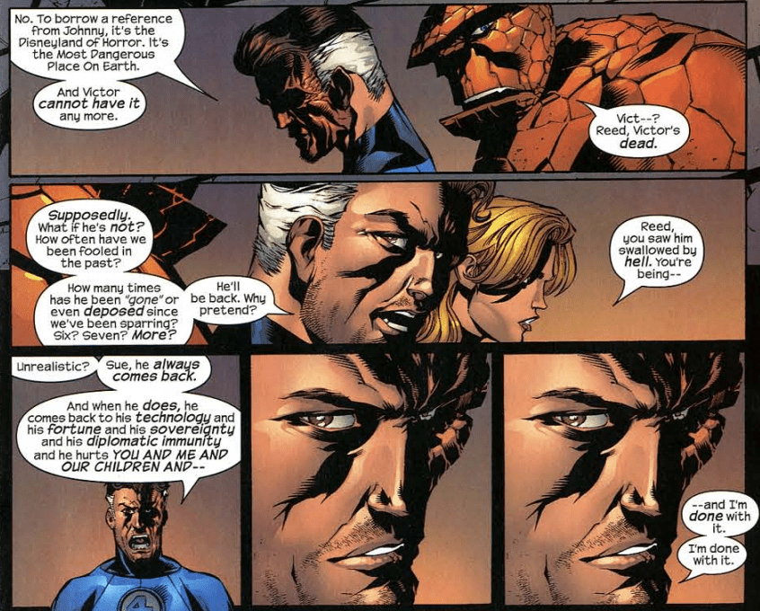After being silent and stoic throughout the issue, Reed finally explains his thoughts. He says it’s inevitable that Dr. Doom will return from the dead, because he always does. Reed says that when Doom returns, he will again rise to power in Latveria through his wealth, sovereignty and diplomatic immunity. He further says that only the Fantastic Four has the power and the know-how to properly dismantle all of Doom’s weapons and infrastructure. “When he does rise again, he finds we’ve left him with nothing,” Reed says. The FF then join their hands together in their classic “4” pose.
