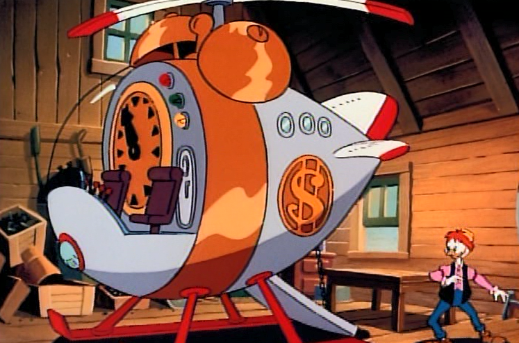 Fasten your seatbelts: The time machine has been built into helicopter form, so Launchpad is able to fly it.