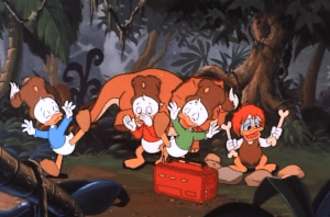 Bubba then reveals he has bloodhound-like tracking skills, and he picks up the scent of the time machine. The trail leads back to the T-rex, who is keeping the time machine in a nest, like a big egg. They defeat the T-rex by making it slip on banana peels (!). The boys want to bring Bubba to the present with them, but Scrooge says he belongs in his own time. There’s a sad goodbye, only for the T-rex to attack again. The nephews dump the dinosaur bones to chase off the T-rex, which also gives Bubba and Tootsie an opening to sneak on board the time machine. The time machine takes off again, to parts and time unknown.