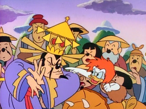 Here’s what happens: To save a land deal with Glomgold from going bad, Scrooge uses a frozen substance named Bombastium to go back in time. Be he and the gang went too far back, to prehistoric times, taking Bubba the caveduck with them. This episode begins with the time crashing in ancient China. Bubba wants to help, but Scrooge dismisses him as a pest. Scrooge is enamored of a nearby city with a golden tower. He and Launchpad investigate, to find Mung-Ho, a man who has tricked the populace into thinking he has magic powers, about to execute the lovely and honest princess Sen-Sen. She encourages the people to “trust the prophecy.” Launchpad tries to save the day, but he and Scrooge also get captured.