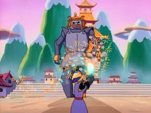 The bandits send a giant to attack Scrooge. Fights him off with a pen laser. The bandits next attack the city gates, but Launchpad causes an avalanche to stop them. Mung-Ho and the bandits attack again, while Scrooge and co. discover the giant iron statue in the center of town is an ancient mech (!) and they defeat the villains Megazord-style. (Zordon: “Alpha, bring me my Zune!”) This and avalanche fulfill the second and third parts of the prophecy. With peace restored, Sen-Sen wants Bubba to stay, but Scrooge points out that Sen-Sen was the Great One all along. Our heroes hop back into the time machine and disappear off to next week’s episode.