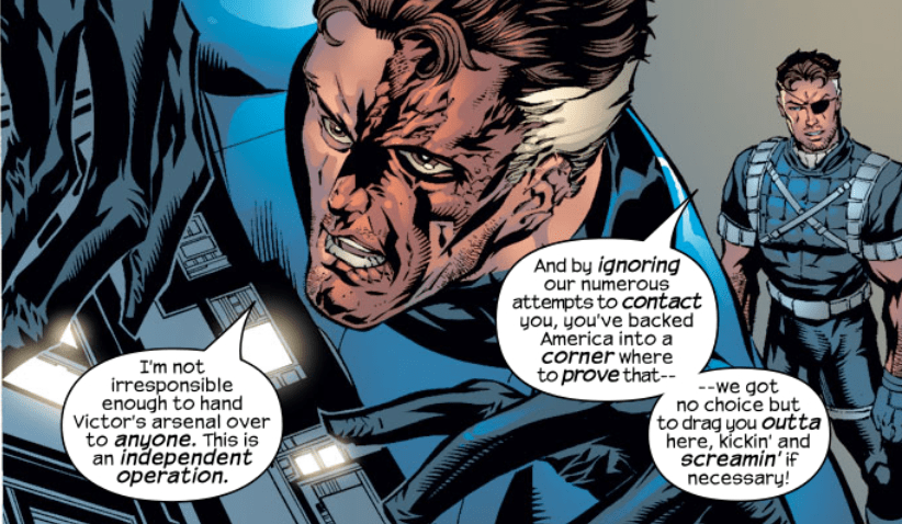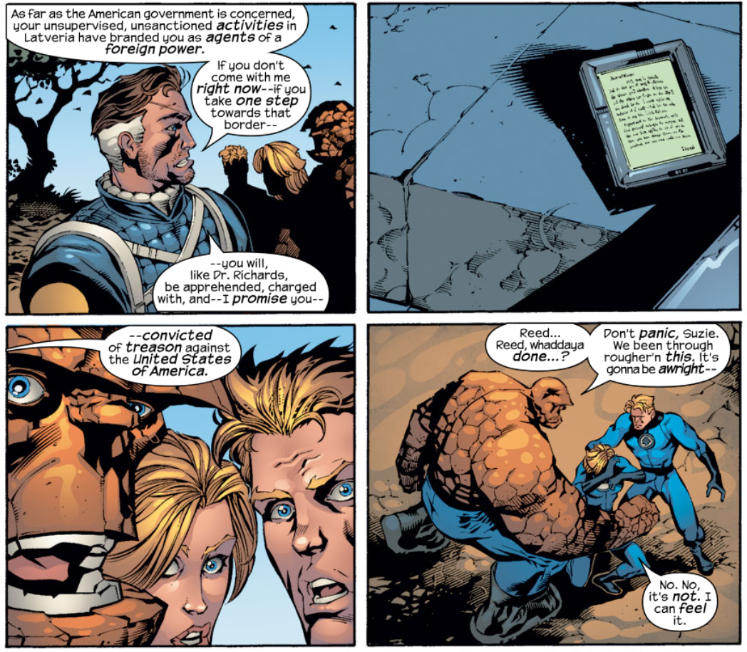 At the border, Fury tells the three FFers that Reed has given him no choice but to attack, thanks to his refusal to negotiate the U.N. Fury says he plans to apprehend Reed and him convicted on charges of treason against the United States. The scene then cuts back to Reed’s letter, and we see he started it with the words, “By the time you find this, I’ll be dead.”