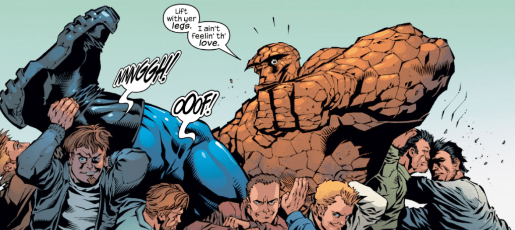 Clobberin’ time: In celebration, a bunch of Latverians lift up Ben and carry him around parade-style. Reminder that our old friend The Official Handbook of the Marvel Universe: Deluxe Edition states that Ben weighs approximately 500 pounds.
