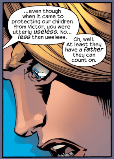 Sue, Ben, and Johnny jump into action, protecting the people from the Doombots. Reed stays behind, saying to himself, “Take that, Victor.” The Latverians celebrate, cheering the FF as heroes. Alone, Reed admits that what he’s doing is still not enough, and that he’s run out of time. The other three return to the castle, and Reed admits the fight was a set-up, so that the people’s allegiance will now be with the FF against Doom, when/if Doom ever returns. Sue confronts Reed on his behavior, and he admits he’s more after revenge because Doom scarring his face. But then, Reed says that during the fight in issue #500, their children were endangered not because of Dr. Doom, but because of Sue’s inaction. He tells her “You were utterly useless. No… less than useless.”