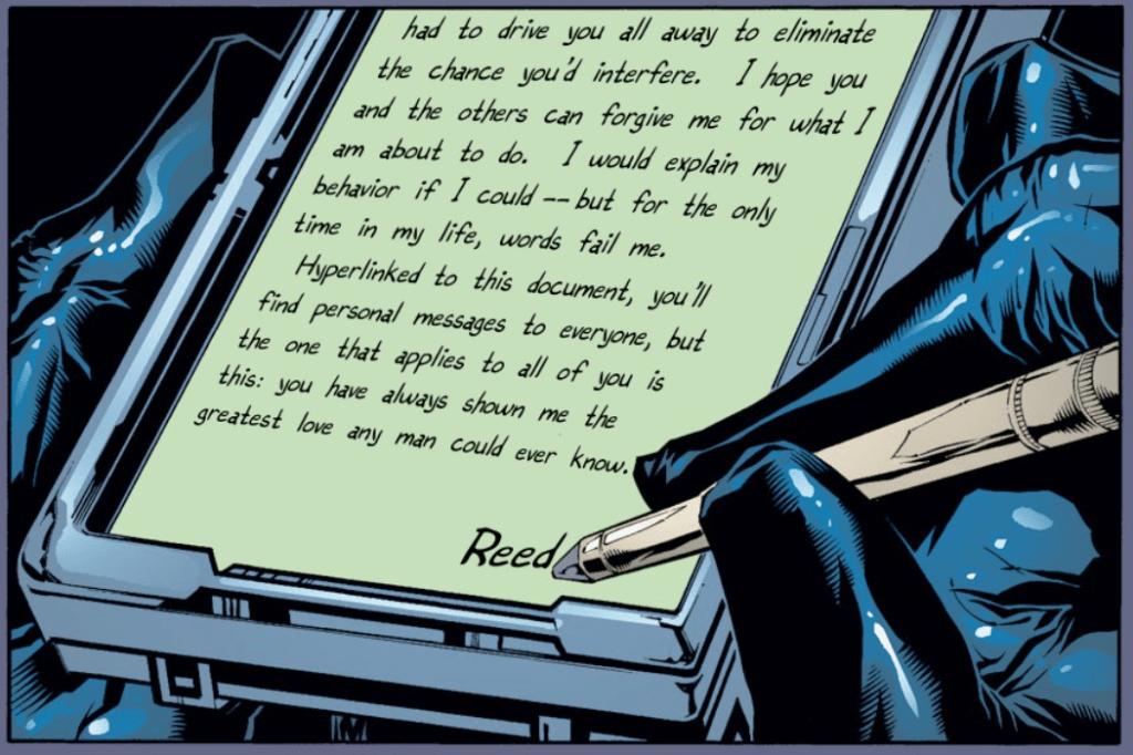 Before the FF have to time to react to this horrific backstab, things get worse. Reed informs everyone that Nick Fury’s deadline is up, and that the U.N. are about to begin a mass invasion of Latveria. Sue, Ben, and Johnny leave Castle Doom in hopes of contacting Fury and putting a stop to the troops. Once he’s alone, Reed writes a letter to his teammates, stating that he had to drive them away, and that he hopes that somebody they can forgive him.