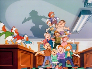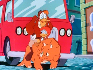 The kids take Bubba to school with them, where he is an instant hit among their classmates. He takes out the boom box from two episodes ago, and there’s a rockin’ musical number about how great Bubba is. (!) The impromptu party lands Huey, Dewey, and Louie in detention, but not Bubba. Mrs. Beakeley is up next, showing Bubba some civilization by taking him to a fancy socialite party. Bubba and the Beagle Boys run amok and ruin the party. Then Scrooge gets Launchpad to babysit Bubba, where the Beagle Boys makes another failed attempt to nab him. Launchpad takes Bubba to a museum to see a dinosaur display, which freaks Bubba out. He and his pet triceratops Tootsie wreck the place.