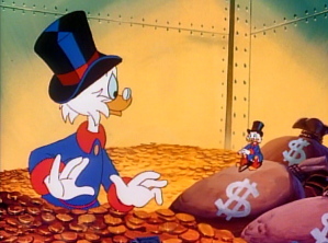 In the Money Bin, Scrooge visited by another, tiny Scrooge. This is his conscience, who tells him that deep down inside, he actually likes Bubba. Scrooge’s conscience says that as soon as Scrooge stops blaming Bubba for his problems, his problems will go away. But then, Bubba mistakes a fire hose for a snake and calls for help, unknowingly letting the Beagle Boys into the money bin.