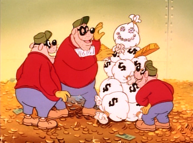 The episode begins with Scrooge and Bubba kicked out of the money bin, and Scrooge blaming Bubba for all his troubles. Bubba runs off, and Scrooge starts planning his retaliation. Complicating matters is that Scrooge still owes Glomgold $10 million to complete the land deal. Inside, the Beagle Boys do their own swimming-in-the-money gag, and they contact Glomgold to tell him they’re not working for him anymore. Then the police and the army (!) surround the Money Bin, and the Boys then ask for Glomgold’s help after all.