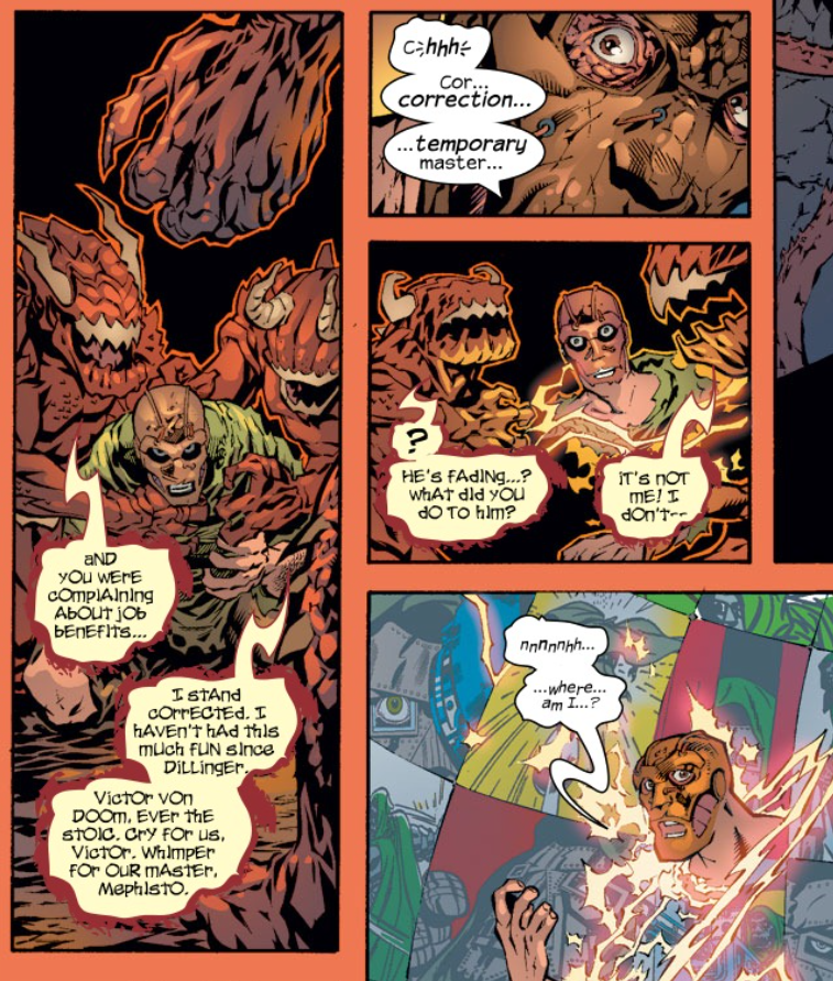 The Marvel Wiki insists that the demons tormenting Dr. Doom are the Hazareth Three, the same ones he dealt with to get his jacked-up sorcery powers at the start of this storyline. This would appear to be their final appearance. The Hazarath Three also name-drop Mephisto, so add this issue to the debates about whether Mephisto is the actual devil, or a devil-like cosmic being.