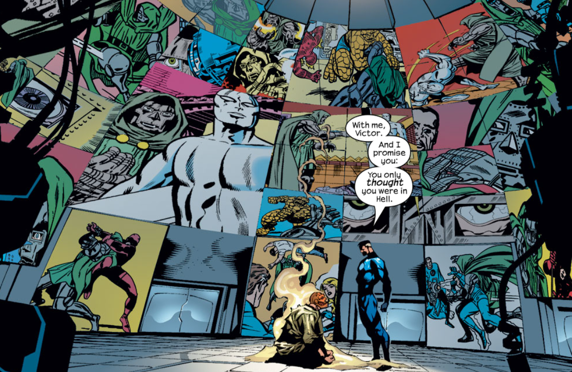Cut to Hell (yes, the Hell) where Dr. Doom is held prisoner by two demons trying to get a reaction out of him. He fades away from Hell and enter a domed room with images of his past all around him. Reed is there, and he tells Doom, “You only thought you were in Hell.” Reed explains that they are in a “Mobius dimension” of Reed’s invention. Any door Doom exits leads him back to the center of the room. There is no exit for either of them. Reed says he’s trapped Doom to keep him where Reed can see him.