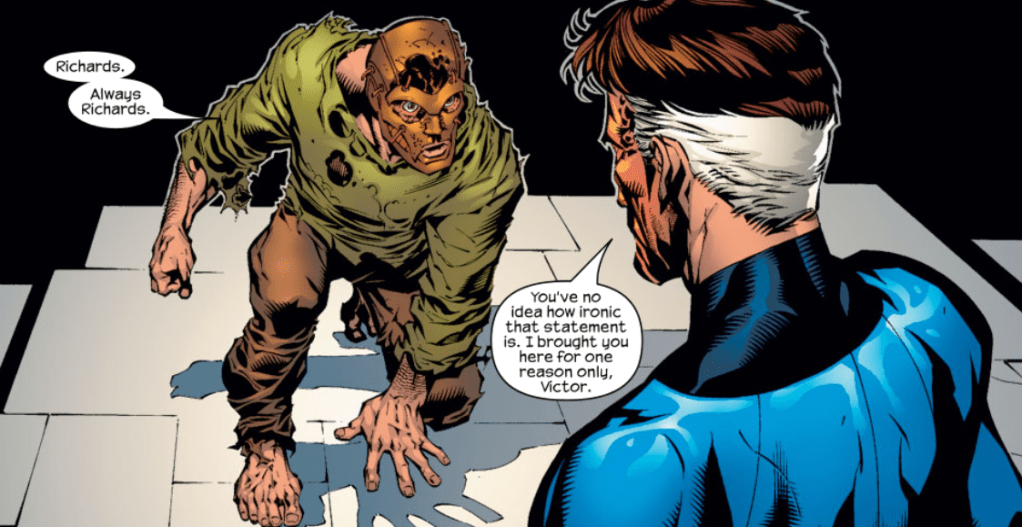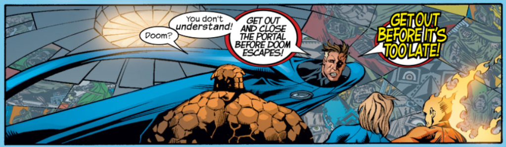 Reed and Doom banter some more, referencing Doom’s origin, and how Reed tried to warn him about the experiment that mangled Doom’s face. Doom then turns on Reed, saying that he’s the real jailer, and this room is punishment for Reed’s sins. Reed says it doesn’t matter either way, because there is no way out for either of them. Then, as if on cue, Sue, Ben, and Johnny come smashing through the wall. Reed tells them to get out before Doom escapes.