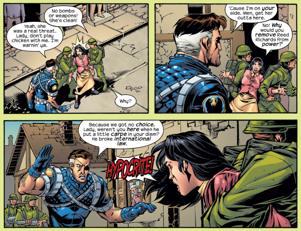 In Latveria, we’re reunited with Nadja, the female Latverian soldier from the start of this arc. She’s a civilian now, following Reed’s orders that the army stand down to avoid bloodshed. She jumps out in front of Fury and the U.S. troops. Fury tells her he has no choice but to invade because Reed violated international law. She calls him a hypocrite. She says Doom’s crimes over the years were far worse, but the U.N. always granted him diplomatic immunity. Other Latverians march into the street voicing similar sentiments, hoping that Reed will fight Doom if Doom returns.