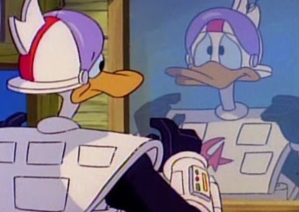 For the password, Gyro picks “blatherskite” out of the dictionary, unaware that “blabbering blatherskite” is the exclamation Fenton keeps saying over and over. Fenton sneaks into Gyro’s lab and can’t figure out how to get the armor to work, until he says those fateful words, “blabbering blatherskite.” All the pieces of the armor seem to spring to life and start floating around the room, attaching themselves to Fenton one by one. He is now… Gizmoduck! He hides his face behind the armor’s visor and tells Gyro he’s the new security guard.