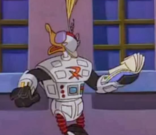 Your move, creep: Gizmoduck is a combination of Robocop, Iron Man, and Inspector Gadget. His gear in this one include a floating umbrella and suggestive-sounding midriff missiles. His most important tool, though, is how both his legs are now a big wheel, which doesn’t make sense but comes in handy during a high-speed chase.