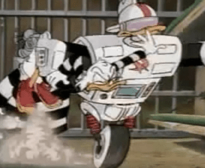 Your move, creep: Gizmoduck’s only real high-tech wonder this time is his awesome strength, busting through prison walls with his fists. When the money bin crashes into the ocean, Gizmoduck doesn’t follow, saying he can’t do water.