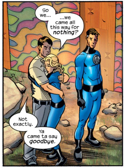 Only they don’t go home, because Reed remains fixated on the door. Daniel says they can’t blame Reed for being curious, and that he has a message from “the man upstairs,” which is simply to stay. He invites to the FF, and their kids, to remain in Heaven forever, where Reed will have instant access to the answers to every scientific mystery in creation. Reed gives the old it’s-not-the-destination-it’s-the-journey speech. Daniel says “Good answer,” and the door opens. Daniel tells the FF to enjoy their visit, establishing that this is not a one-way trip. Ben and Daniel say their goodbyes, and the FF jump, not walk, into the light.