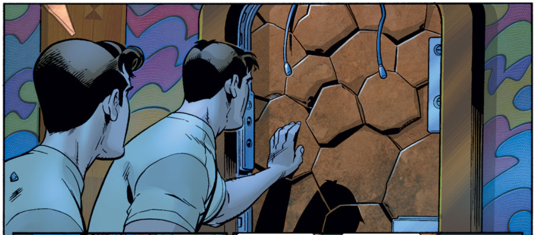 Ben tries the door again. It opens, to reveal the Thing’s rocky skin on the other side. Ben goes to Reed as Heaven falls apart all around them, saying that Ben put the door there, not Reed. Reed wasn’t holding Ben back, but instead Ben was holding himself back. Ben says he’s not ready to let go. “I’m not leavin’ ya, Reed,” he says. “I’m never leavin’ ya.” With that, the quake stops, and our heroes are reunited with hugs and smiles. Ben says he’s ready to go home.