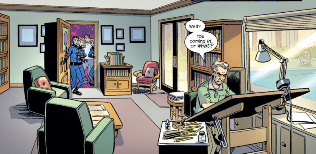 The FF fly through some cosmic grandeur, made of both space stuff and mechanical gears, before arriving at another door. The open it to meet God himself, and… it’s Jack Kirby!
