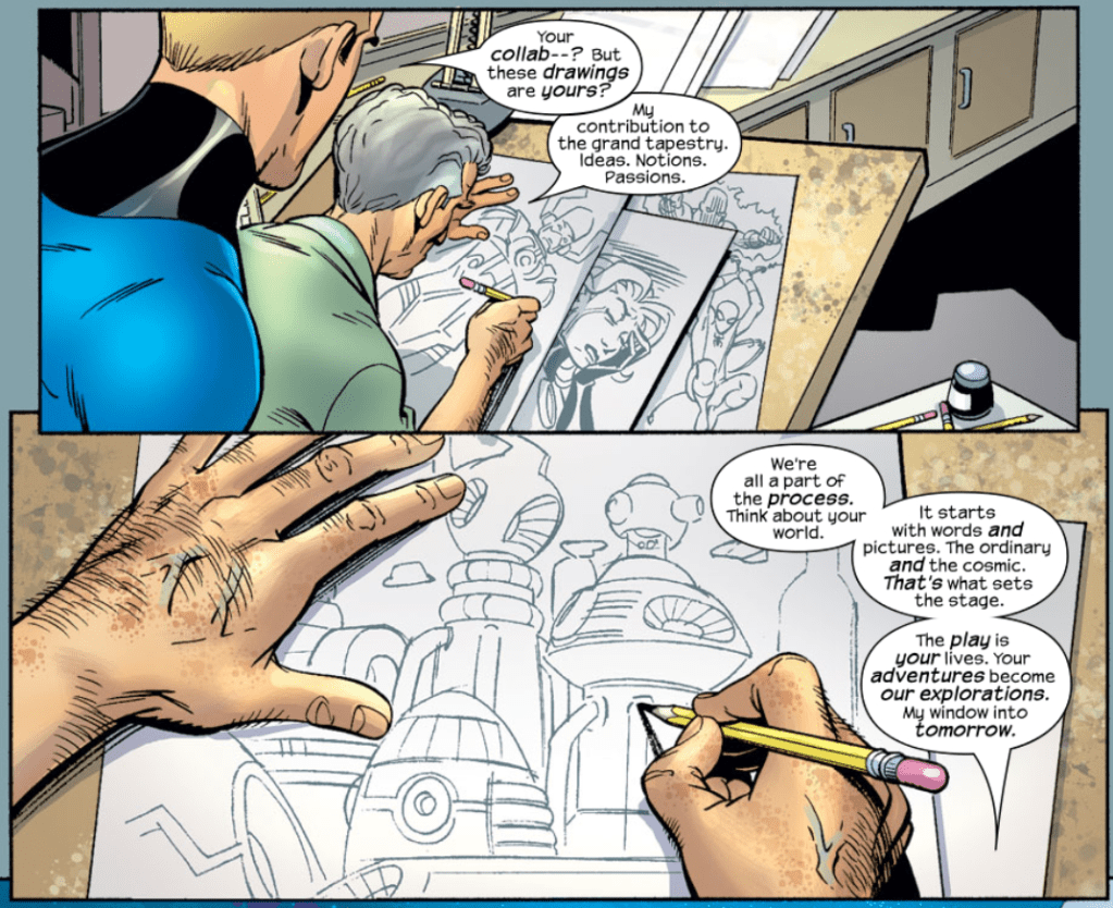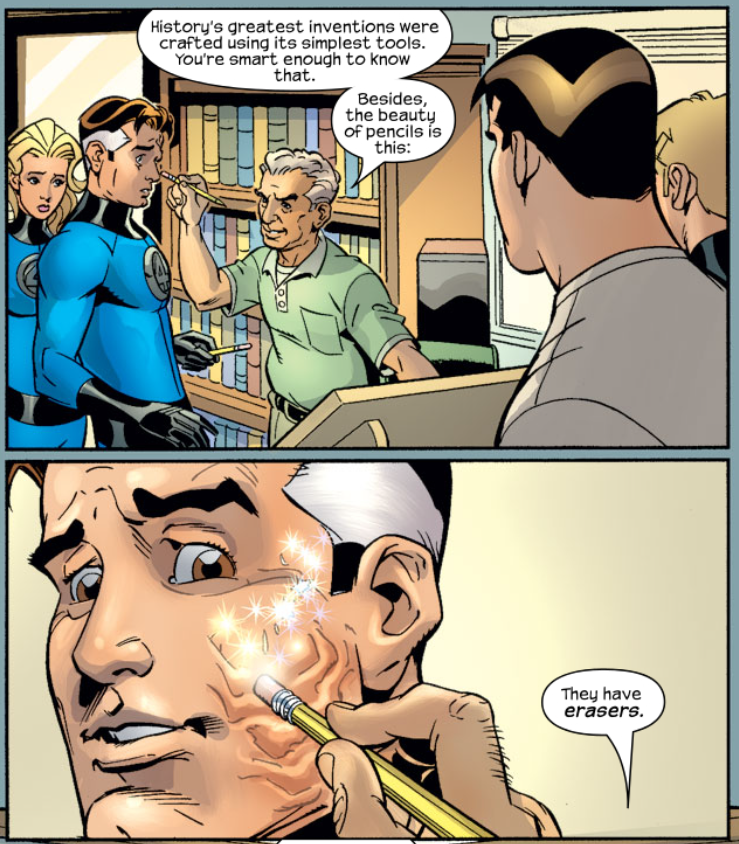 Reed doubts that a pencil is the key to the universe, but Kirby tells him all of history’s greatest inventions began with simple tools. He adds that pencils also have erasers, and he uses his to erase the scars from Reed’s face. He tells Johnny that the FF are nobody’s puppets, but that “We’re all our own storytellers, and there are plenty of stories still left in you.” He then returns Ben to his rocky form, matter-of-factly saying everybody knows that how Ben will come back. He also matter-of-factly adds that Reed’s machine that brought them there will never work a second time. “I admire your imagination,” he says to Reed. “I always have.”