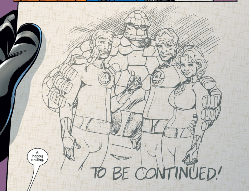 As the FF are transported away from Heaven, Johnny asks for a souvenir, and Kirby says he’ll whip something up. The FF reappear back in the new Baxter Building, safe and sound. The souvenir is a pencil drawing of an older Fantastic Four with the words “To be continued!” on it. Reed describes the drawing as “a happy ending.”