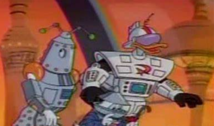 Cut to later, when Launchpad has acquired the U.S.S. Jumpstart, the cheapest spaceship he could find on short notice. Scrooge, Launchpad, and Gizmoduck follow the spaceship’s trail to an all-metal planet. It’s an all-robot planet, as we see in a message from the Master Electronic Leader, and that all non-robots must be destroyed. Gizmoduck learns that the robots plan to melt the bin so they can use the gold to make more robots.
