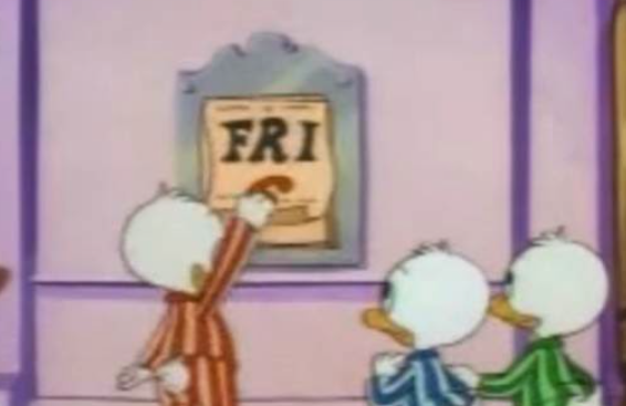 The three boys hatch a plan to make Scrooge think the next day is Saturday, not Friday, so they can get their allowance. This means changing all the calendars in the house and resetting all the clocks. They even hack Scrooge’s radio, pretending to be a DJ saying it’s Saturday. Scrooge is confused at first, but starts believing it. Scrooge has a conference call with his executives, insisting the whole time that it’s Saturday and not Friday, and the nervous executives all start to believe it, too. Word of the date change spreads throughout Duckburg, with the whole city and then the entire world assuming Scrooge is right and everyone else is wrong.