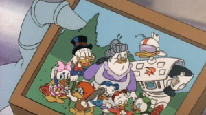 Everybody walk the dinosaur: The Disney Wiki alleges that this is the only time Bubba and Gizmoduck are in the same episode, although they don’t share a scene. They can also be spotted together with the rest of the cast in a family photo. (Launchpad is not in the photo, suggesting he’s already halfway out the door to join the spinoff.)
