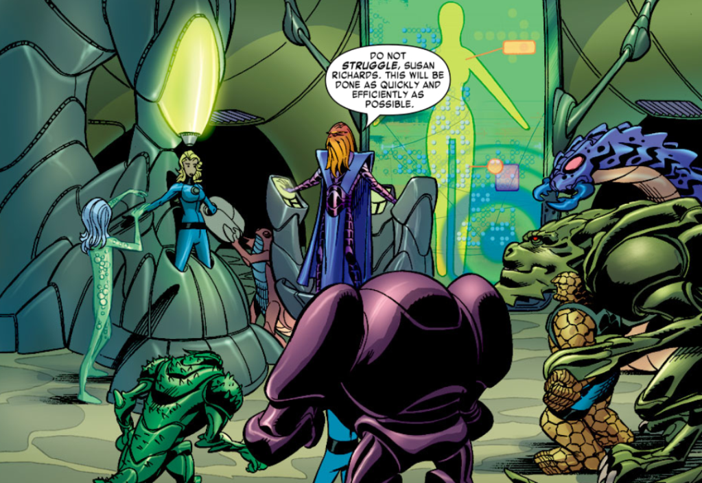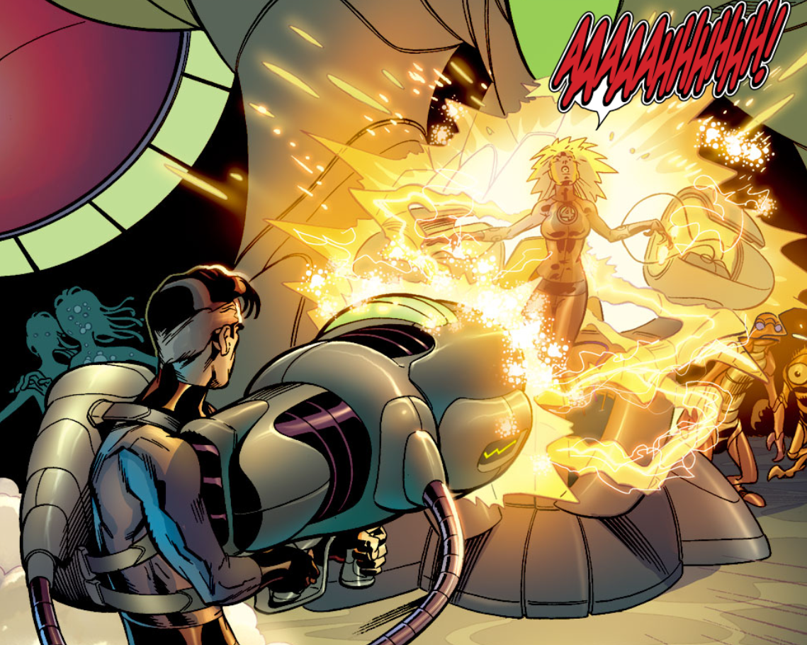This issue begins with Zius strapping Sue to a strange device to prevent her from using her force fields while the other aliens keep the rest of the FF at bay. Zius says he is no murderer, yet this seems like an execution. Sue pleads for one last chance to say goodbye to her children. Johnny tries to fight back but is stopped by the aliens. Zius is about to. Then Reed busts through a wall with one of the aliens’ weapons. Instead of fighting the aliens, however, he turns the weapon on Sue and fires.