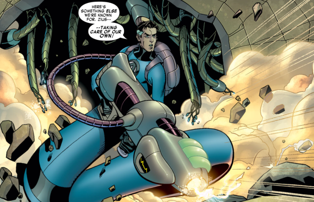 Unstable molecule: I’m a little unclear as to how Reed’s plan works. There’s one panel of Zius checking out an image of Sue on his computer, and that’s all we get to see that he’s been tricked, even though he’s been shown to have nearly godlike power. Let’s just say his weapon also messes with their sensors somehow.