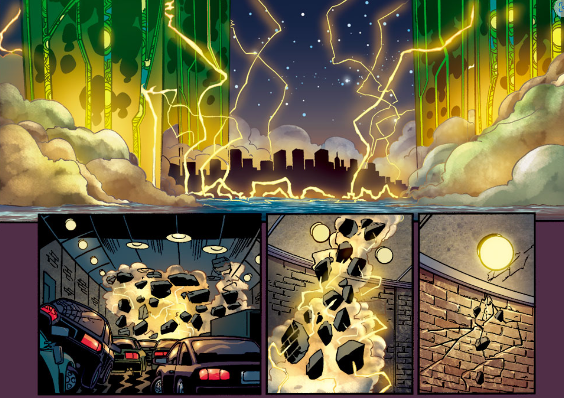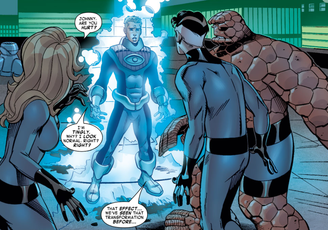 Galactus fires an energy beam down at the building, striking Johnny. Johnny isn’t hurt, but instead is transformed. He’s glowing with energy and has a new outfit with a big eye on his chest. Johnny realizes it’s Sue’s powers that both Zius and Galactus are after. As Galactus’ hand reaches for Johnny, he says, “This bites.”