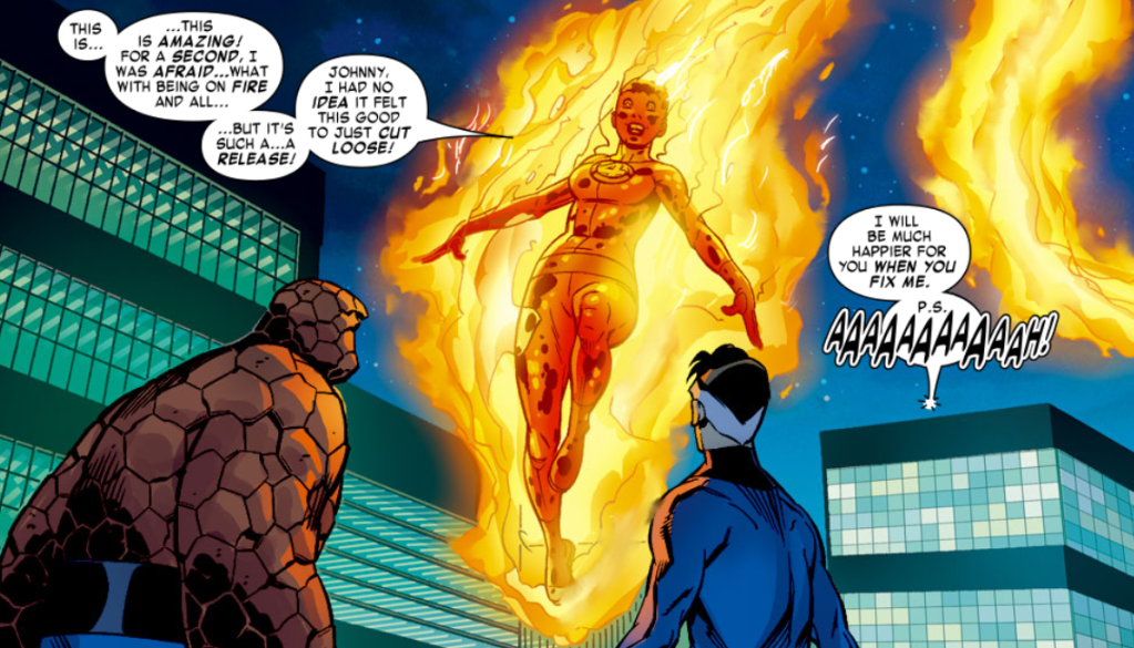 Fade out: Sue says Johnny’s powers have a frightening burning sensation as first, but then it is freeing as the flames make her lighter than air.