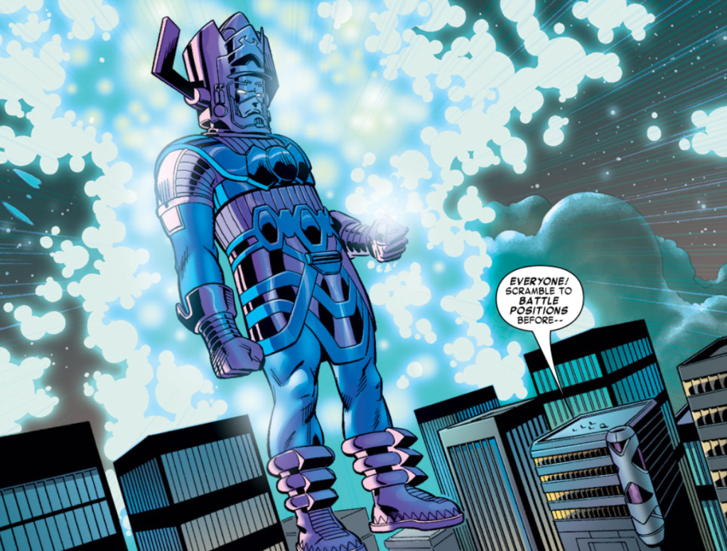 Reed says the procedure can be reversed. He’s about to give Sue and Johnny their own powers back, when they look up to see a giant hand reach down and grab hold of the departing alien ships. There’s an image in the sky of Zius suffering in pain, and then the hand destroys the ships. Turn the page and we see it’s Galactus, looming large over the city.