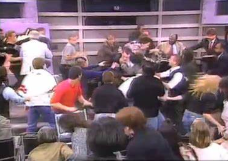 Reference row: TV talk show hosts Oprah Webfeet and Geralduck Rivera are obvious parodies of real-life TV personalities Oprah Winfrey and Geraldo Rivera. And of course the episode spoofs the famous episode of Geraldo where a brawl broke out on set.