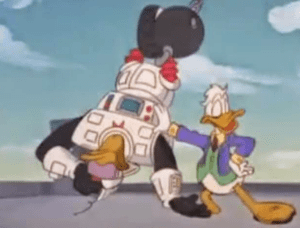 Your move, creep: Gizmoduck finds the Beagle Boys’ hideout using his “ultraviolet tracker-tracker.” Later, Launchpad turns Gizmoduck’s legs into a big drill, fires a city-destroying rocket, and lets a bunch of birds out of the top of his head. (Are those robot birds, or what?)