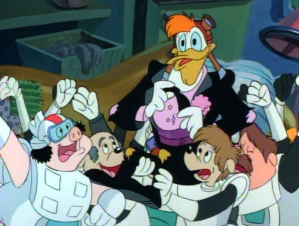 Reporters converge on the Money Bin, where Launchpad tells Huey, Dewey, and Louie that he will bear his soul. He addresses the press, with Fenton planning to appear as Gizmoduck during Launchpad’s speech. But then Launchpad quotes Fenton saying “Blabbering blatherskite,” not knowing that’s the code to activate the Gizmoduck armor. The armor affixes itself to Launchpad in front of everyone.