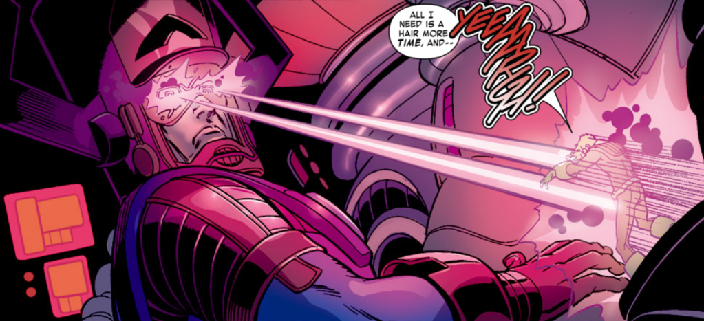 It then dawns on Johnny that Galactus needs Johnny for Johnny’s humanity. Galactus only appears humanoid to other humans because that’s how human brains process his appearance. In reality, Galactus is a being so cosmic that human senses are beneath him. Johnny then calls Galactus by his original name, Galen. This gets Galactus’ attention. He turns to Johnny and says, “Go on.” And with that, the story is…