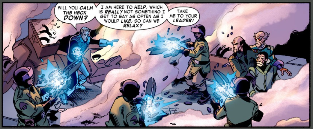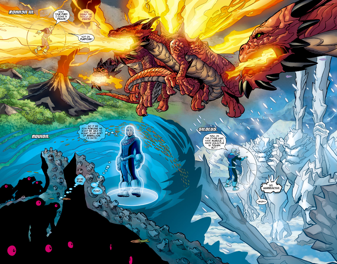 While flying through space, Sue worries that becoming a herald has made Johnny cold and inhuman, like the Silver Surfer was when we first met him. Turn the page, and we see Johnny enjoying the perks of being a herald as he flies around in an outer space hot rod. Later, Galactus’ ship appears above an alien planet. The aliens believe their planet is undetectable, and they have seen no sign of a herald. Then Johnny appears before them. They aliens attack him, only for him to easily defend himself. He talks to the planet’s leader, saying he has no intention of delivering their planet to Galactus, but he might have no choice unless he finds an uninhabited planet that can satisfy Galactus’ hunger. The aliens try to convince Johnny to sic Galactus on their enemies, and Johnny won’t have it, saying “People really are alike all over.”