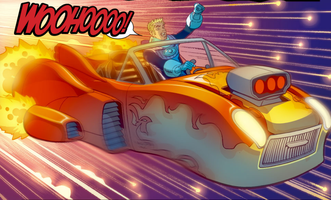 Flame on: Johnny uses his cool hot rod only once, using the rest of the issue to fly around on invisible force fields.