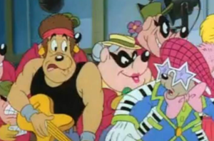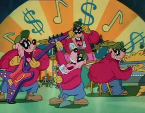 Foul fowls: Instead of a trio, this time we have quartet of Beagle Boys with Big Time, Bouncer, Burger, and Baggy. Big Time sings, Burger is on guitar, Baggy plays piano, and Bouncer is on drums.