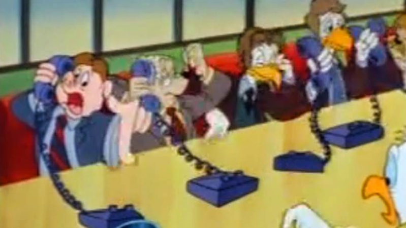 At the mansion, the kids start taking calls on Scrooge’s business line. First as a mistake, but then they see an opportunity in running Scrooge’s many businesses. The kids meet with the businessmen to learn that their on-the-fly financial decisions are turning huge profits. This includes fulfilling their wish of having tons of new flavors at the malt shop. As the kids get more and more successful, they also get more and more ruthless, thrilling at rejecting others’ business proposals. Ma and the Beagle Boys try breaking into the money bin, only to be thwarted by the boys’ new defenses.