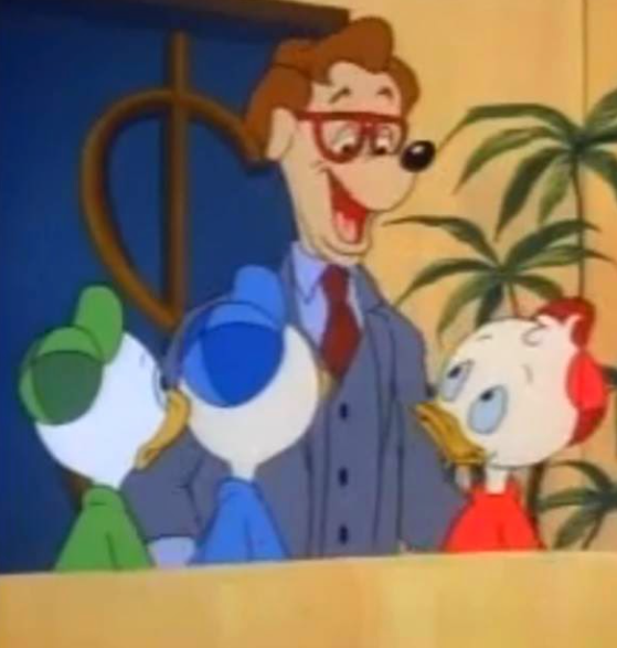 Junior Woodchucks: The three boys mix and match their colors for once. Huey wears a red suit with a green tie, Dewey wears a blue suit with a red tie, and Louie wears a green suit with a blue tie.