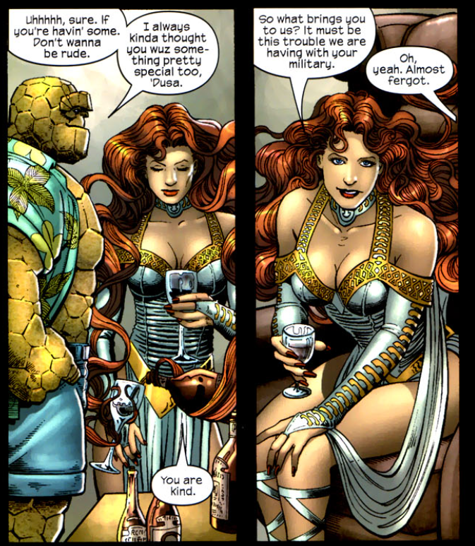 Ben talks with Medusa, asking her to let him talk to the President and to General Thunderbolt Ross to ease the tension. Ben and Medusa are quite flirtatious, saying if they were not already in relationships, they might have something together. They hug and instead agree to remain just friends. Black Bolt then arrives, and thinks the hug is something more. He attacks Ben. They fight, with the other Inhumans cracking jokes from the sidelines. Medusa insists they break up the brawl.