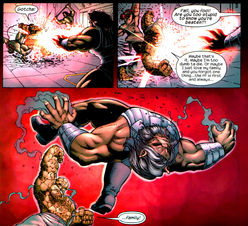 Back in the present, Charlie keeps asking whether Ben and Medusa actually hooked up, and Ben insists they never did. Charlie continues to be jealous of Ben, saying Ben can anywhere he wants and do anything he wants. Ben says it’s not the powers that matter, but what’s in your heart. Then it’s another flashback, to when Sue was pregnant with Franklin. (The Inhumans vs. army plot goes unresolved.) Sue grouses about Reed going on adventures while she stays home, and Ben reminds her how much Reed loves her. Then Blastaar the Living Bomb-burst comes through the Negative Zone portal on a mission to kill both Sue and the baby. Ben fights the villains while Sue contacts Avengers mansion. Blastaar confronts Sue, but Ben protects her, saying that the FF is first and foremost a family.