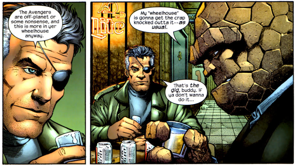 The comic begins in New York, in Stan’s Bar (Get it?) where Ben is hanging out with Nick Fury. Fury is asking for Ben’s help, but Ben tells him to call someone else, as he has upcoming vacation plans. Fury says this gig is in Ben’s wheelhouse, and that Ben doesn’t have a choice. He’s to report to Fort Duke army base immediately.