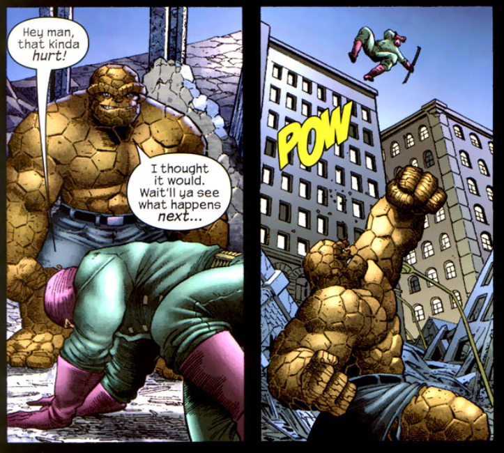 Ben shows up at the base and meets Corporal Charlie Proctor, his driver. They banter while on a long drive through the desert. Charlie asks if being a superhero is fun, and Ben says it often falls on him to do grunt work. There are exceptions, though, and he tells Charlie about one night when the police called him to help fight the Wrecker in Times Square. Ben clobbers the Wrecker and is celebrated as a hero.